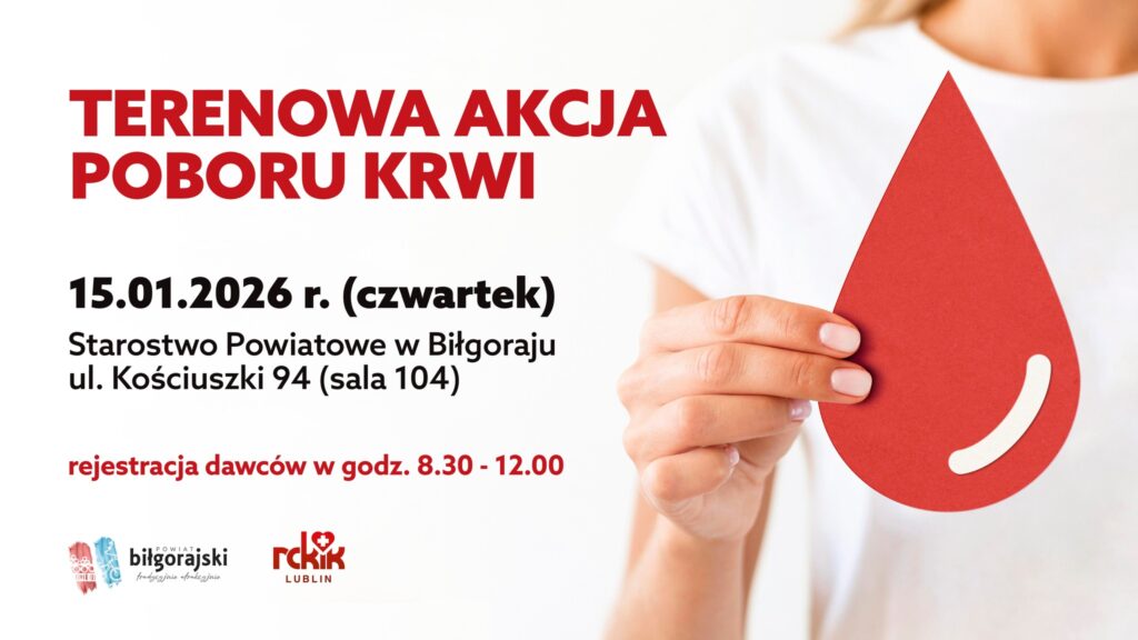 Akcja zostanie przeprowadzona w czwartek, 15 stycznia 2026 roku. Ekipa Regionalnego Centrum Krwiodawstwa i Krwiolecznictwa będzie czekać na ochotników w siedzibie Starostwa Powiatowego w Biłgoraju (ul. Kościuszki 94).